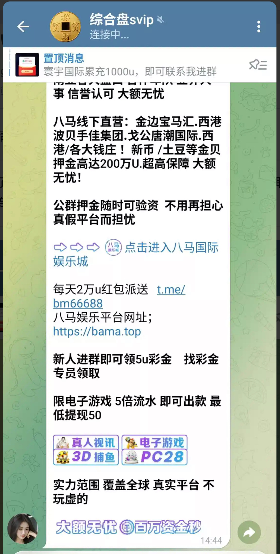 我领了2个号,没打出来,进飞机群,群里有彩金专员,联系彩金专员申请5u新人彩金http://t.me/bm66688